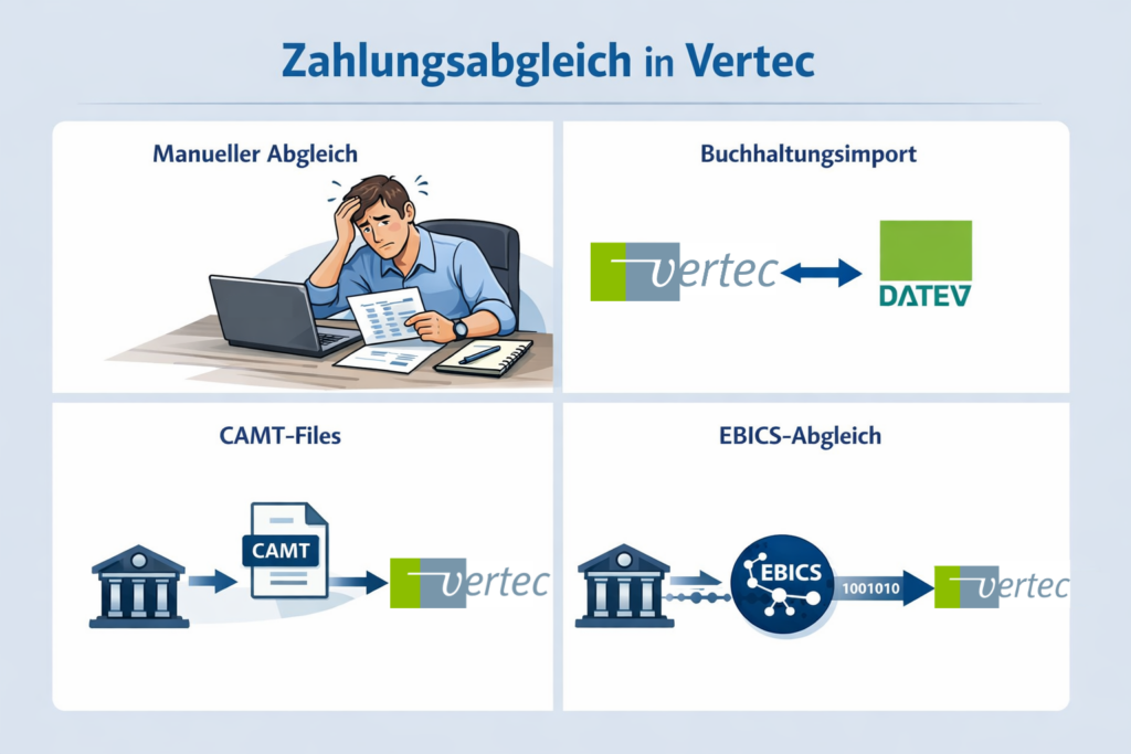 Vertec bietet Schnittstellen zu verschiedenen Buchhaltungssystemen, z. B. zu DATEV, über die Zahlungen importiert und abgeglichen werden können.