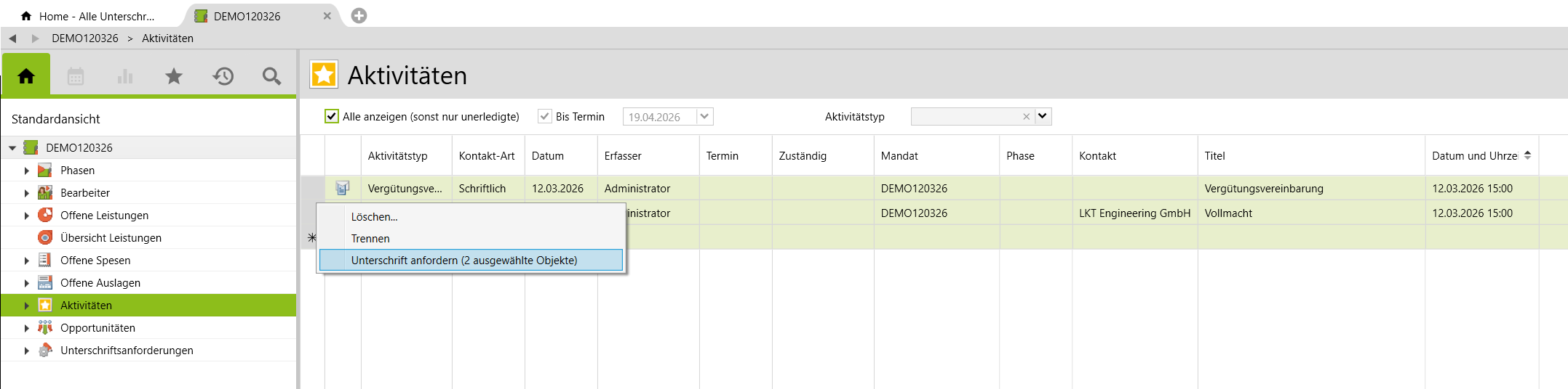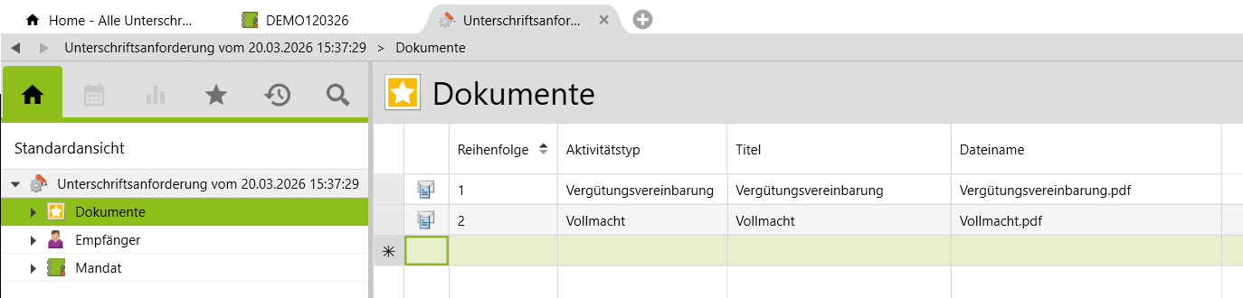 Nach Abschluss des Signaturprozesses wird das unterschriebene Dokument automatisch an der ursprünglichen Aktivität abgelegt.