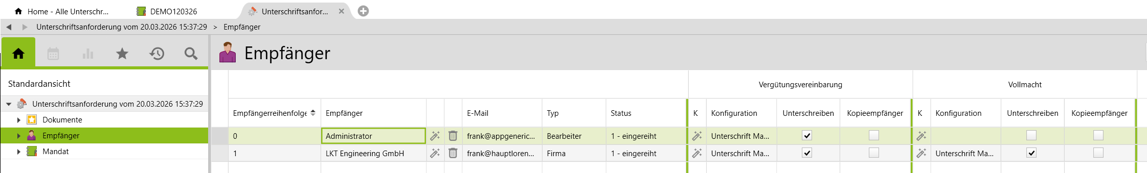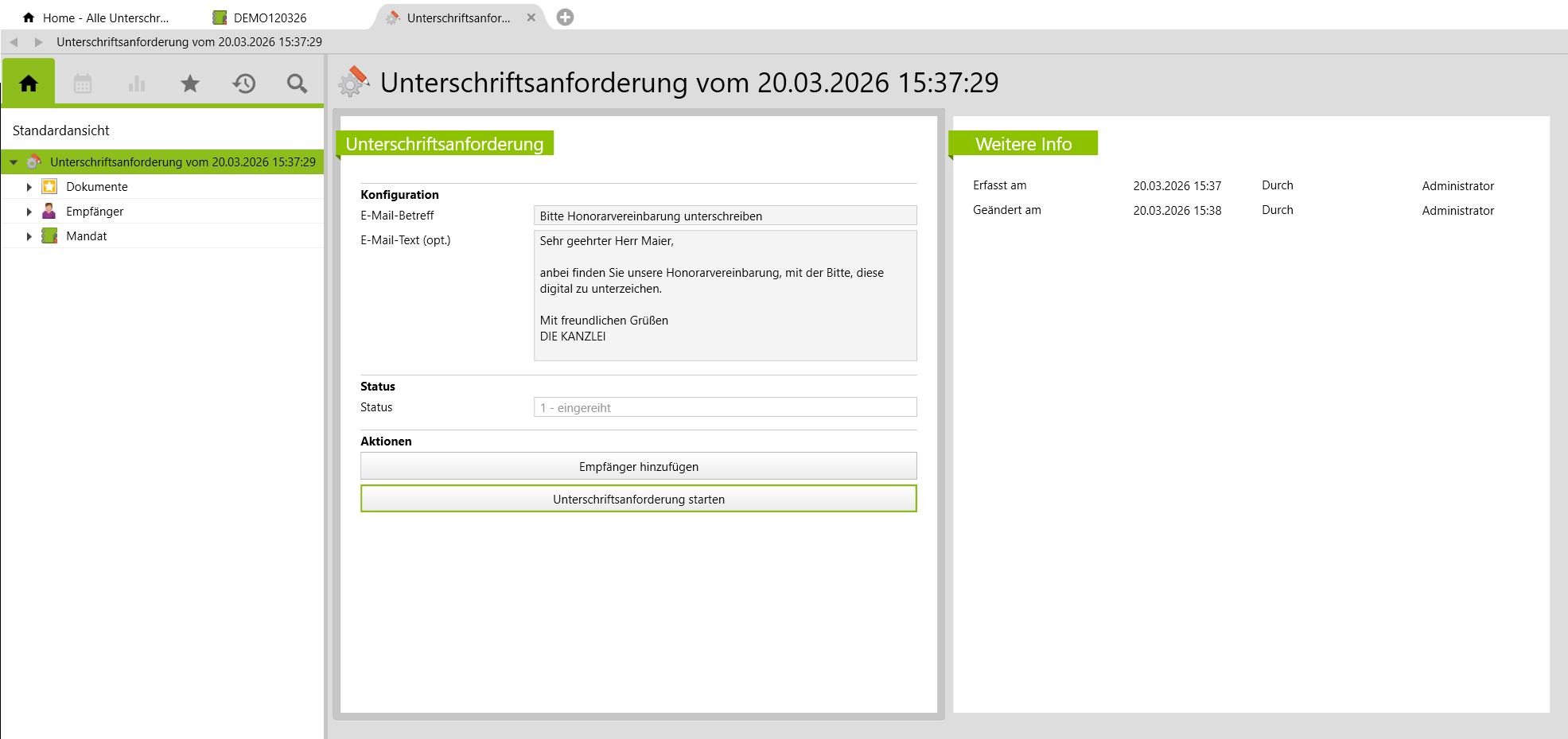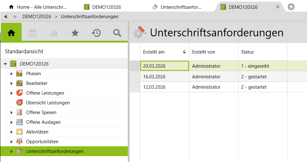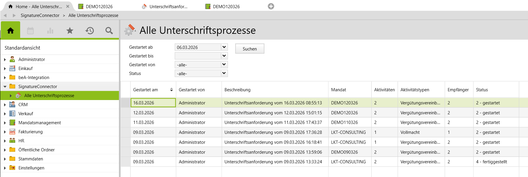 - Aktuell unterstützte Unterschriftsprovider: DocuSign, Acrobat Sign (in Planung), weitere auf Anfrage